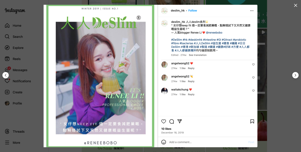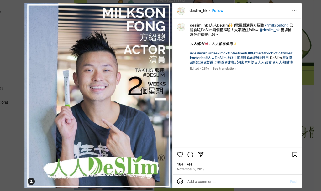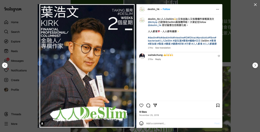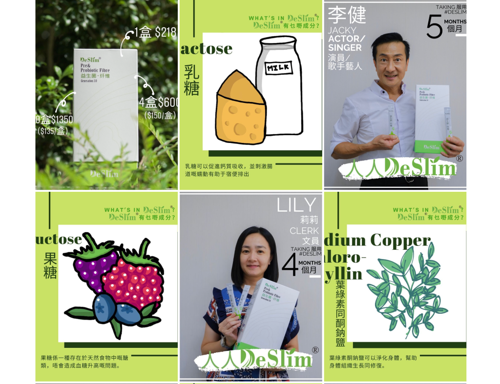 This project is fully planned by AG Advertising and Communication, providing professional marketing management consulting services for DeSlim. The team focuses on promoting DeSlim’s triple-action health product—which combines probiotics, prebiotics, and dietary fiber—through diverse social media campaigns. The project also features guest appearances by Fong Siu Chung, Lee Kin, Yip Ho Man, and Lee Man Ying, further enhancing brand awareness and market competitiveness.