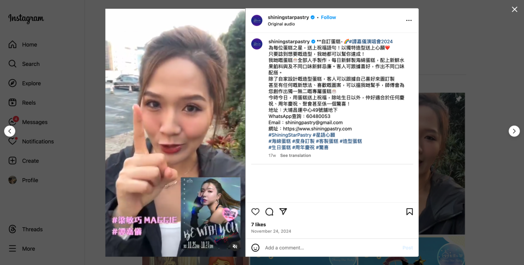 This project is planned by AG Advertising and Communication, specifically designed to create a series of social media marketing strategies for Shining Star Pastry. As the consulting team, AG Advertising and Communication comprehensively assists the brand in increasing its online exposure, with a focus on promoting its popular signature cakes. The project features well-known artist Kayee Tam, leveraging creative content and professional marketing to further enhance the brand image and market influence.\